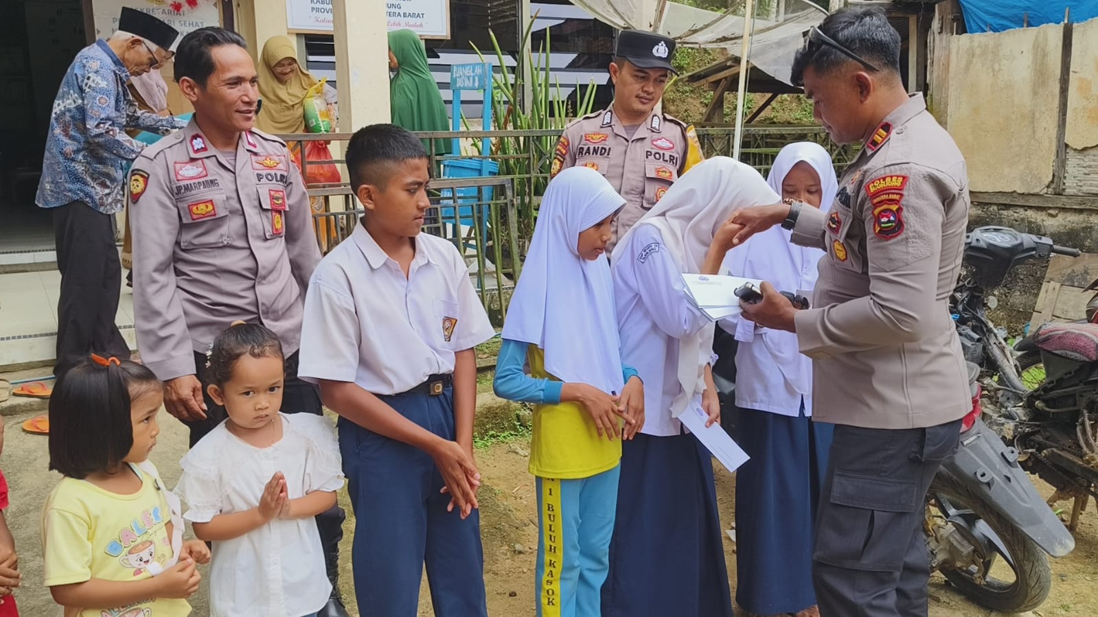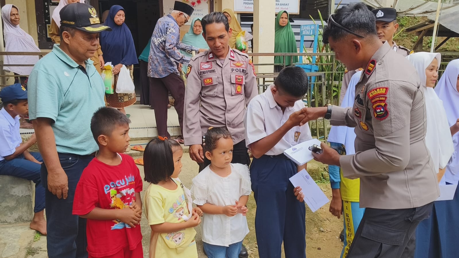 Kapolsek Lubuktarok (Luta) Iptu Welly Wahyudi,S.H.,M.H., mewakili Kapolres Sijunjung, Sumatera Barat, AKBP Willian Harbensyah, S. I. K., M. H., didampingi Walinagari Buluhkasok, Asriwandi, menyerahkan bantuan pada anak yatim-piatu daerah itu. (F.Ist)