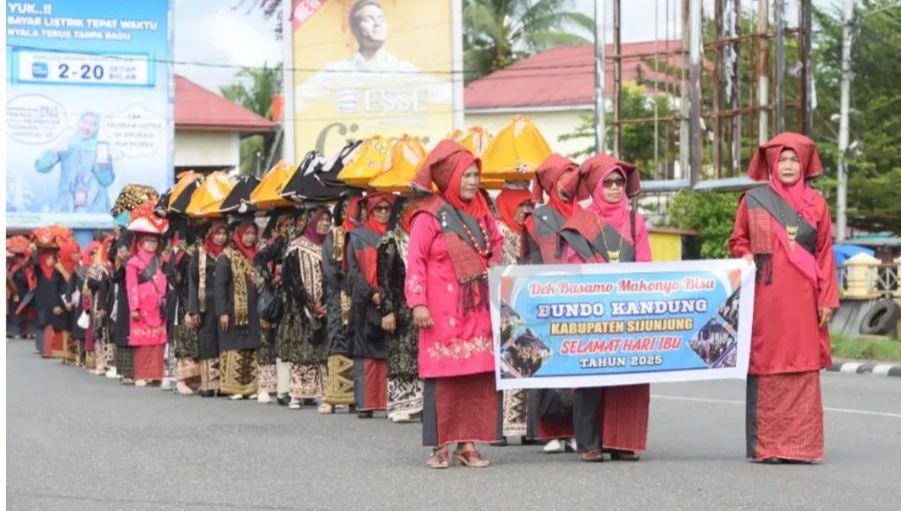 Ratusan Bundo Kanduang di Sijunjung melakukan pawai Baarak Nasi Badulang dalam rangka memperingati Hari Ibu