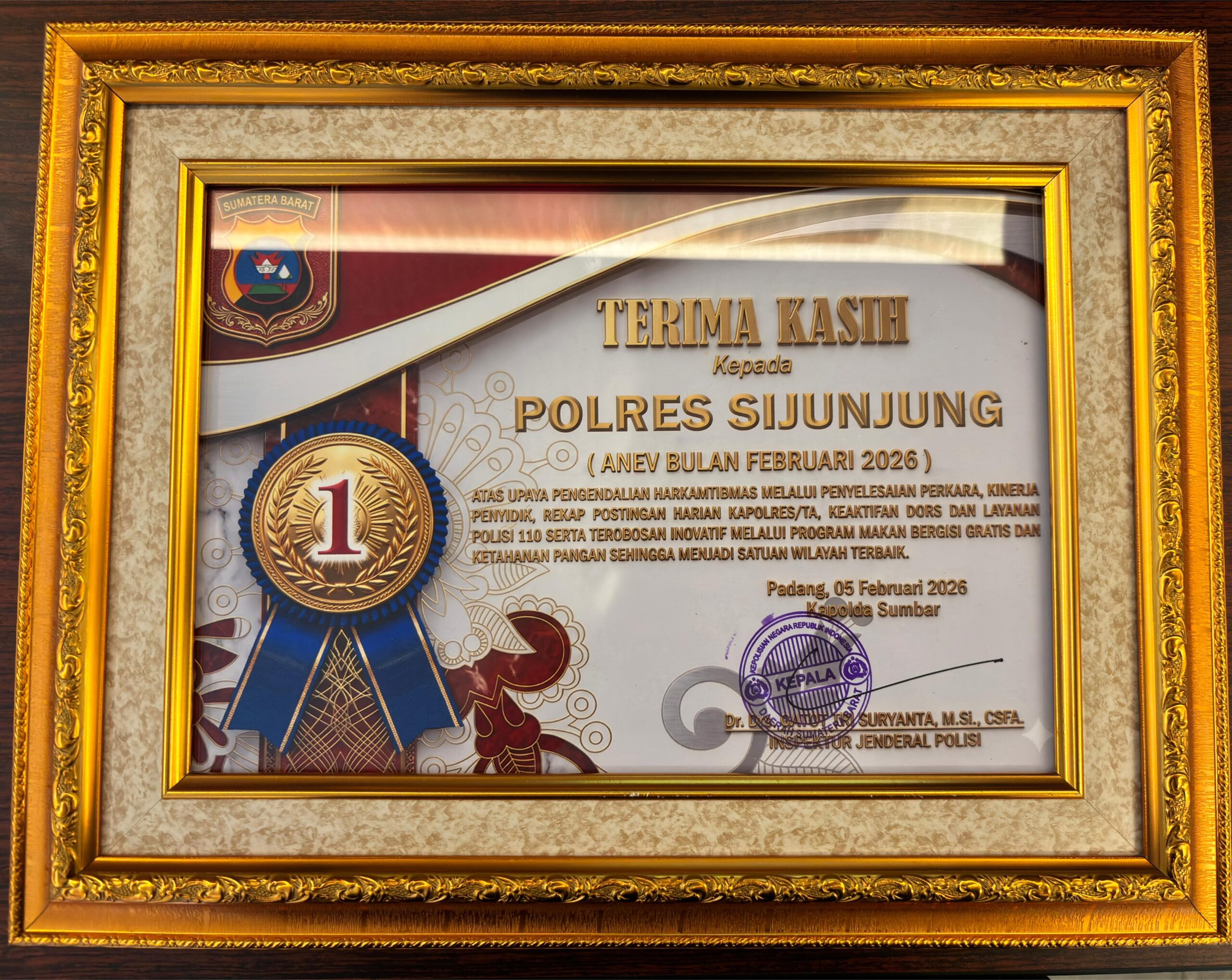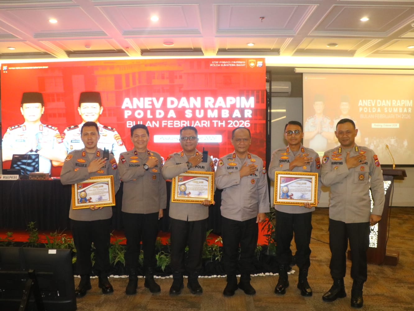 Penghargaan tersebut diberikan langsung oleh Kapolda Sumatera Barat Irjen Pol Gatot Tri Suryanta, dalam kegiatan Anev yang berlangsung di Padang, Kamis (5/3/2026).