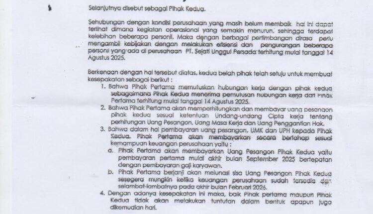 Namun sampai kesepakatan bersama yang telah dilakukan oleh PT SUP dengan karyawan tidak juga terlaksana. Ketika media ini mendapatkan informasi dari salah seorang karyawan bahwa sebelum terjadi pemutusan Hubungan Kerja (PHK) pihak perusahaan menyedorkan kesepakan bersama dengan karyawan akan membayarkan Uang Pesangon, UMPK dan UPH melalui cicilan bertahap selama 6 bulan berturut – turut terhitung pembayaran pertama di lakukan mulai akhir September 2026, dengan alasan keuangan perusahaan yang kurang membaik.
