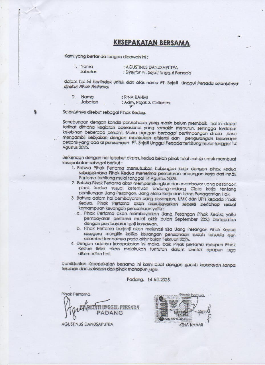 JURNAL SUMBAR| Padang – Miris, begitulah nasib 13 karyawan ex PT SUP yang di PHK (Pemutusan Hubungan Kerja) terhitung sejak tanggal 14 Agustus 2025 di berhentikan oleh Perusahaan PT. Sejati Unggul Persada (PT SUP).