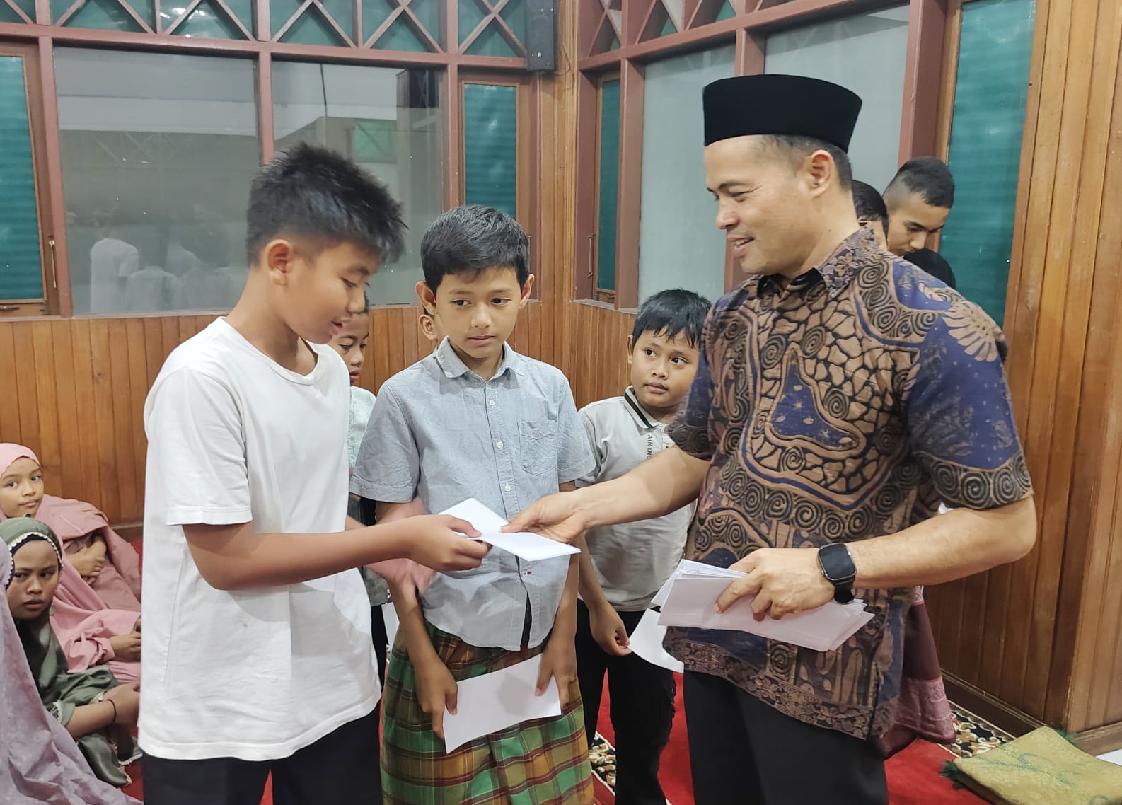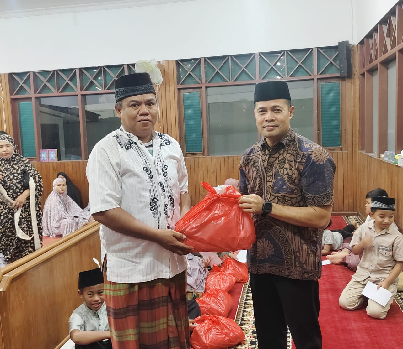 Sebagai bentuk terima kasih dan kepedulian antar sesama, serta bentuk syukur atas nikmat rezeky yang di berikan oleh Allah SWT, Wakil Bupati bersama istri membagikan paket sembako kepada jemaah musholah dan sedekah bagi anak anak yang rutin mengikuti sholat tarwih di musholah tersebut, serta menyalurkan santunan bagi anak yatim yang tinggal disekitaran komplek Musholah Rumah Dinas tersebut.