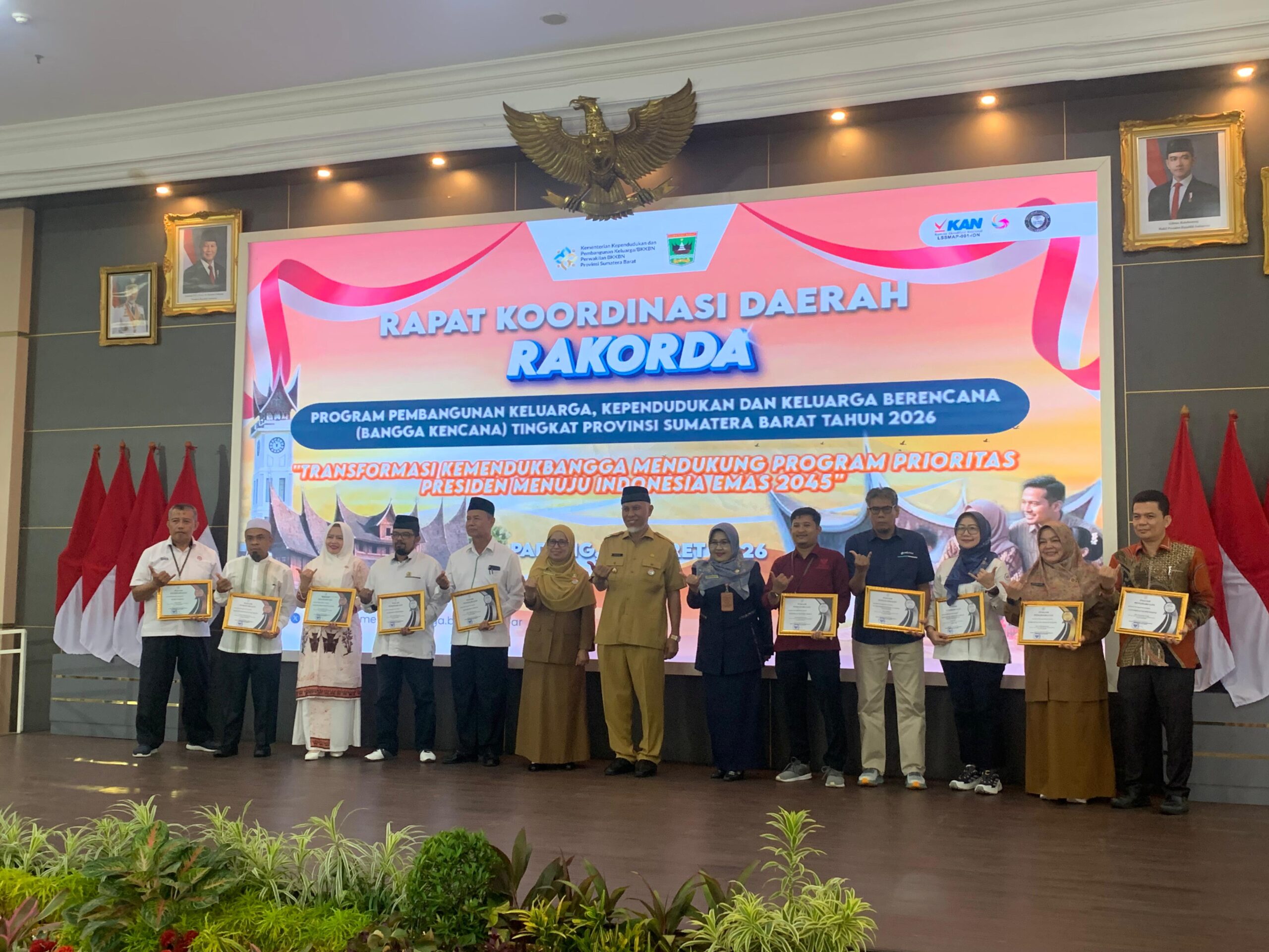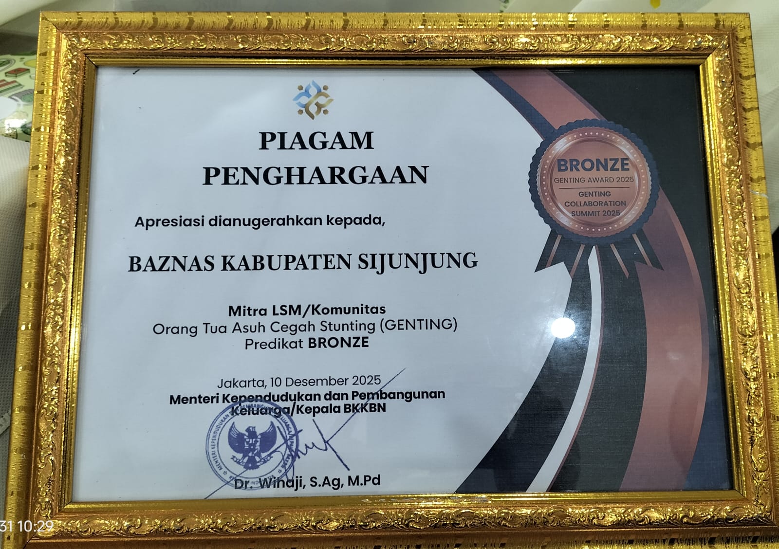 Piagam Penghargaan yang merupakan Apresiasi dari Mentri Kependudukan dan Pembangunan Keluarga/ Kepala BKKBN yang dianugrah kepada BazNas Kabupaten Sijunjung dalam Katagori Mitra /LSM/ Kominitas orang tua asuh cegah stunting (Genting) dengan prediket Bronze itu diserahkan oleh Gubernur Sumatera Barat Mahyeldi Asharullah kepada Ketua Baznas Kabupaten Sijunjung H. Hidayatullah, Lc. MA. pada acara Pembukaan Rakorda Program Bangga Kencana dan Program Prioritas Kemendukbangga/ BKKBN tahun 2026 di Auditorium Gubernur Sumatera Barat di Jalan Sudirman Padang pada Selasa tanggal 31 Maret 2026 lalu.