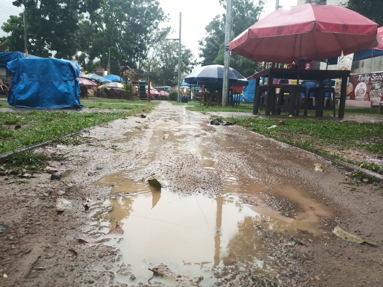 Pantauan di lapangan, Kamis (16/4/2026), genangan air tampak menutupi jalur utama yang menghubungkan deretan gerobak kuliner. Kursi-kursi plastik tergeletak kosong di bawah payung yang mulai kusam. Tidak terlihat aktivitas pembeli, sementara para pedagang hanya duduk diam menunggu di balik etalase kaca dan sudit-sudut gerobak dagangna mereka.